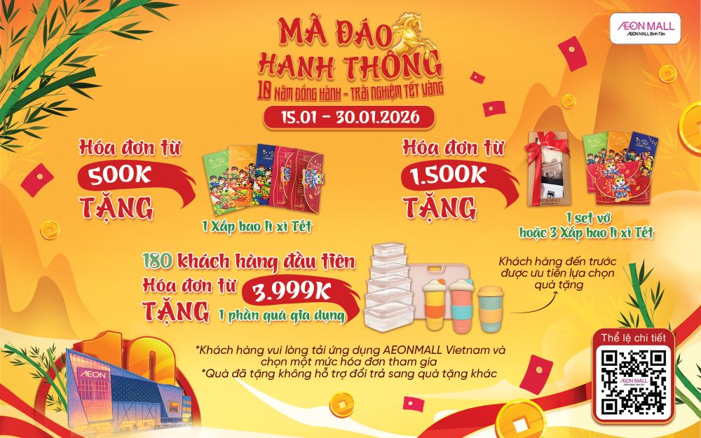 Tết Nguyên Đán 2026 không chỉ là khởi đầu của một năm mới mà còn là dấu mốc vàng son – Kỷ niệm 10 năm AEON MALL Bình Tân đồng hành cùng gia đình Việt. Với chủ đề "Mã Đáo Hanh Thông – Trải Nghiệm Tết Vàng", chúng tôi mang đến một không gian "Tết Vàng" rực rỡ với những món quà tri ân giá trị và các hoạt động văn hóa dân gian đặc sắc kéo dài từ giữa tháng 1 đến hết tháng 2/2026.