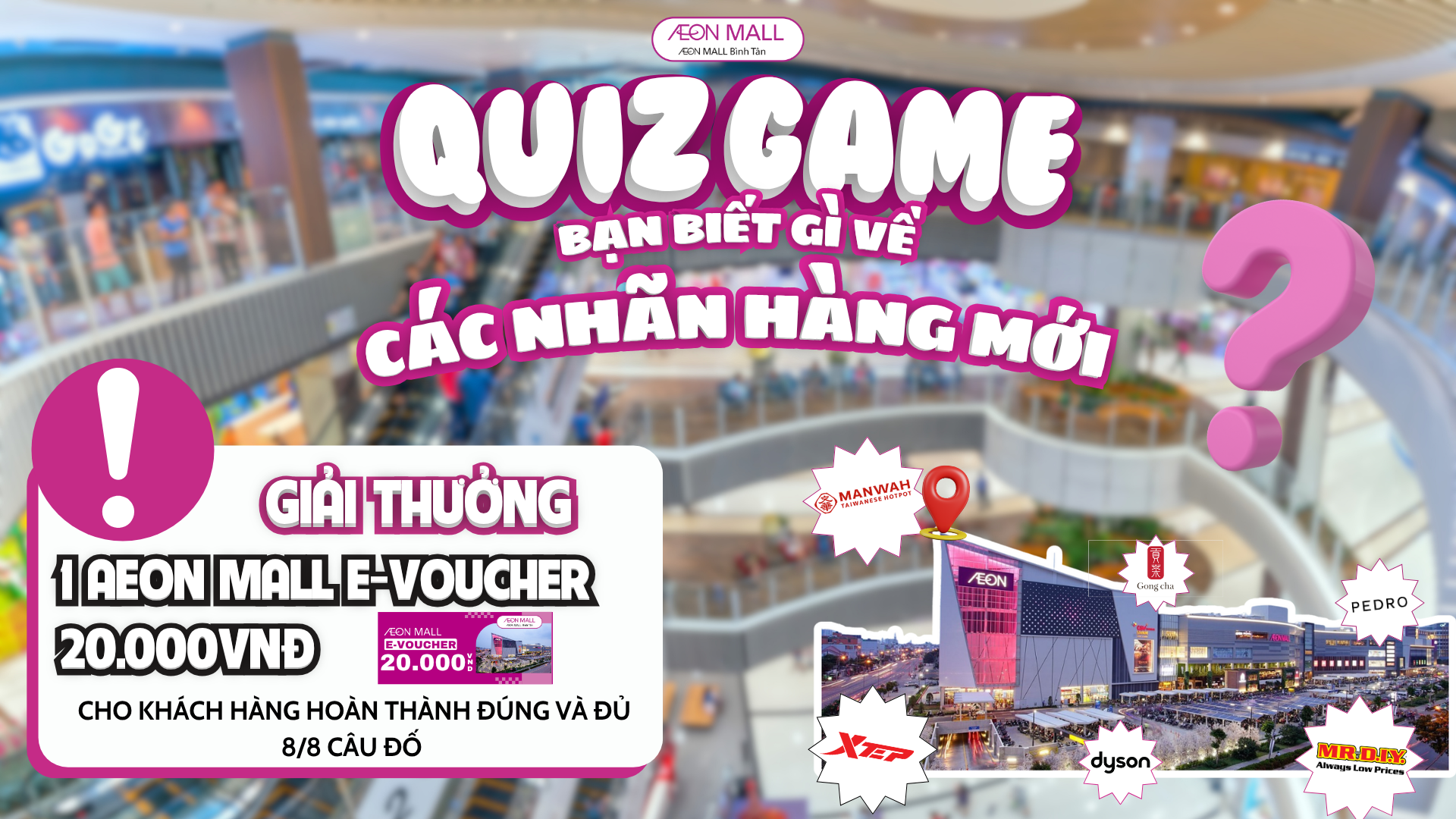 - Trường hợp đáp án câu hỏi Quiz Game Binh Tan bị sai: hãy kiểm tra kỹ đáp án từ nguồn tin đáng tin cậy và bạn vui lòng để lại lời nhắn thông qua Facebook Fanpage: AEON MALL Binh Tan.