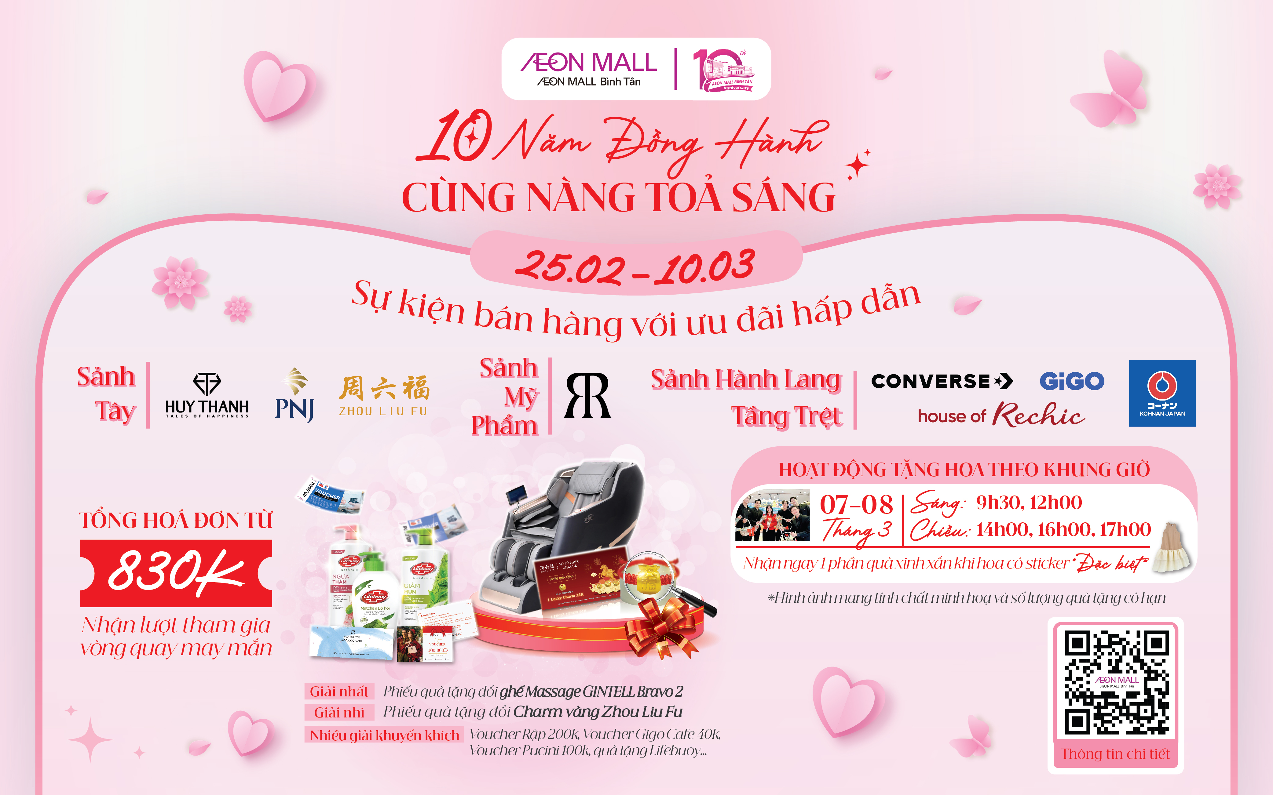Tháng 3 này, AEON MALL Bình Tân không chỉ rộn ràng không khí mừng Ngày Quốc tế Phụ nữ mà còn đánh dấu cột mốc đặc biệt: Kỷ niệm 10 năm đồng hành cùng khách hàng.