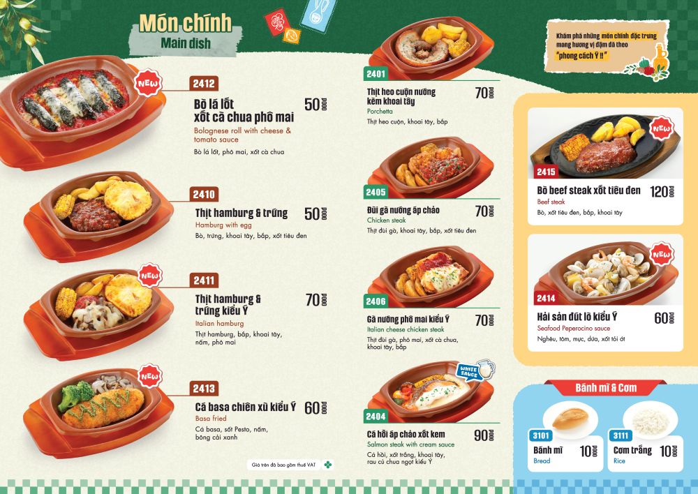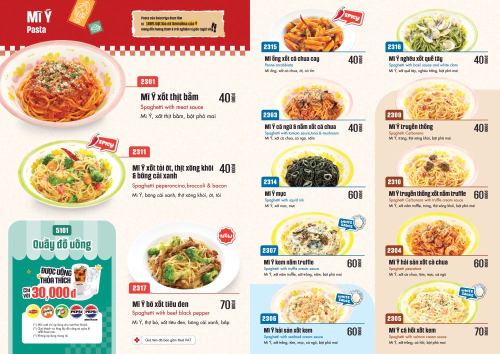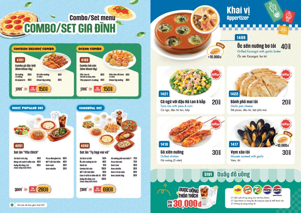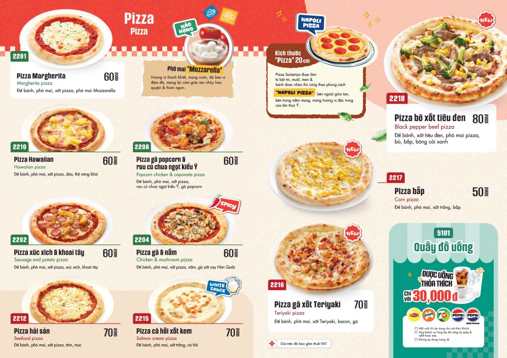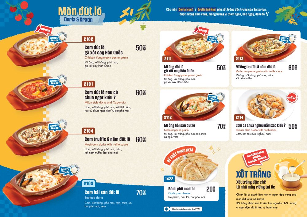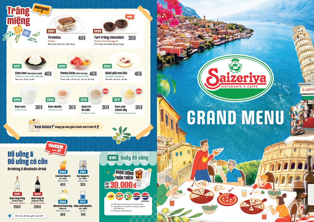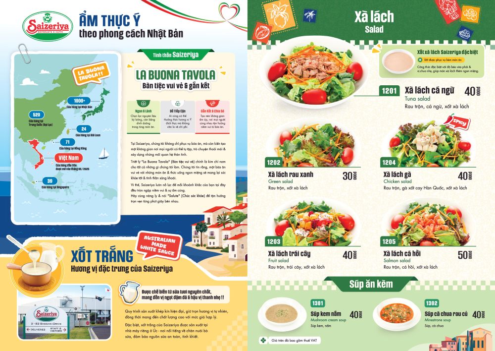 Tất cả các món ăn và đồ uống, từ món khai vị đến món tráng miệng, món ăn nhẹ, đều có sự tinh tế riêng. Việc lựa chọn và kết hợp các yếu tố này cho phép Saizeriya tạo ra bữa ăn kết hợp các giá trị thực phẩm, bổ sung cho nhau để gấp đôi hương vị.