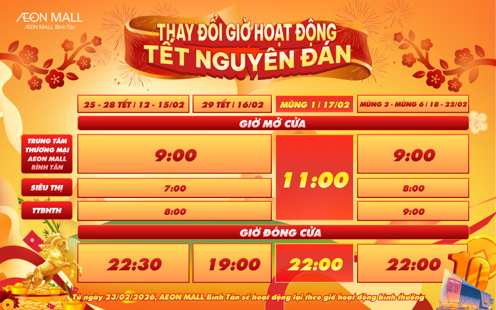 Tết Nguyên Đán 2026 không chỉ là khởi đầu của một năm mới mà còn là dấu mốc vàng son – Kỷ niệm 10 năm AEON MALL Bình Tân đồng hành cùng gia đình Việt. Với chủ đề "Mã Đáo Hanh Thông – Trải Nghiệm Tết Vàng", chúng tôi mang đến một không gian "Tết Vàng" rực rỡ với những món quà tri ân giá trị và các hoạt động văn hóa dân gian đặc sắc kéo dài từ giữa tháng 1 đến hết tháng 2/2026.