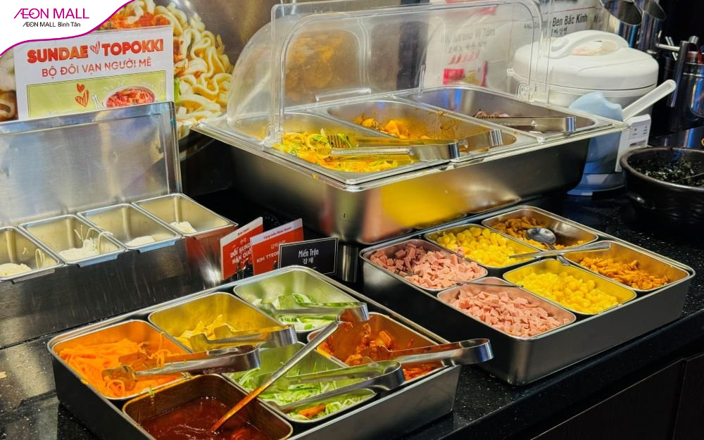 Menu đa dạng với nhiều loại Tteokbokki truyền thống và các món ăn phụ độc đáo. Thực khách có thể tự do kết hợp mì, thịt, rau củ và hải sản theo sở thích, kèm theo đồ uống hấp dẫn như trà và sinh tố.